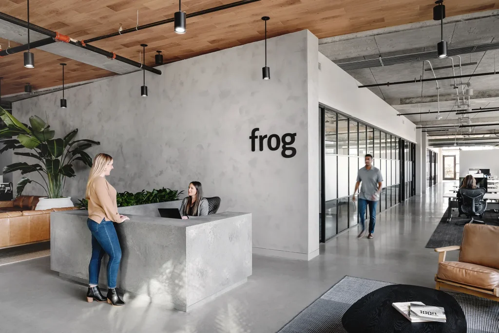 Global design consultancy frog design contracted rand* construction to provide construction services for their new office in the South Congress neighborhood of Austin, Texas. The modern layout of the studio – outfitted with amenities such as a custom cafe and bar – provides a warm welcome for visitors. Venetian plaster-clad walls and ceilings frame public spaces, showcasing them as central gathering places and visual focal points; modern, blackened steel windows are a special feature of the overall design. Flowing into the maker space is a library that provides a private space for teams to engage in quiet collaboration. The office prioritizes staff health, with a generously sized bike storage room, shower rooms, and a multi-functional wellness room that serves as a mother’s room.