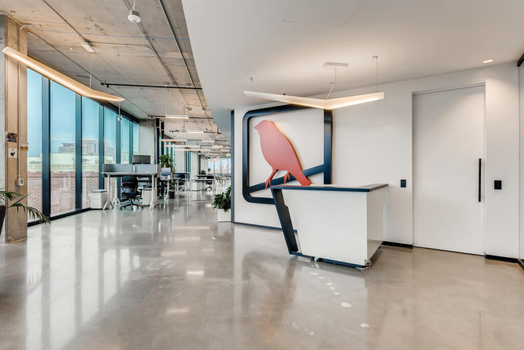 Red Canary relocated their headquarters to the brand-new development, McGregor Square, owned by the Colorado Rockies. The office is located on the 8th and 9th floors of the building, where you get a 360-degree view of the Downtown Denver skyline. The 9th floor also has a terrace, which faces the Rocky Mountain West. The floors contain meeting rooms around the core, with open office seating at the windows. The open floor plan allows everyone in the space to enjoy the natural light.
